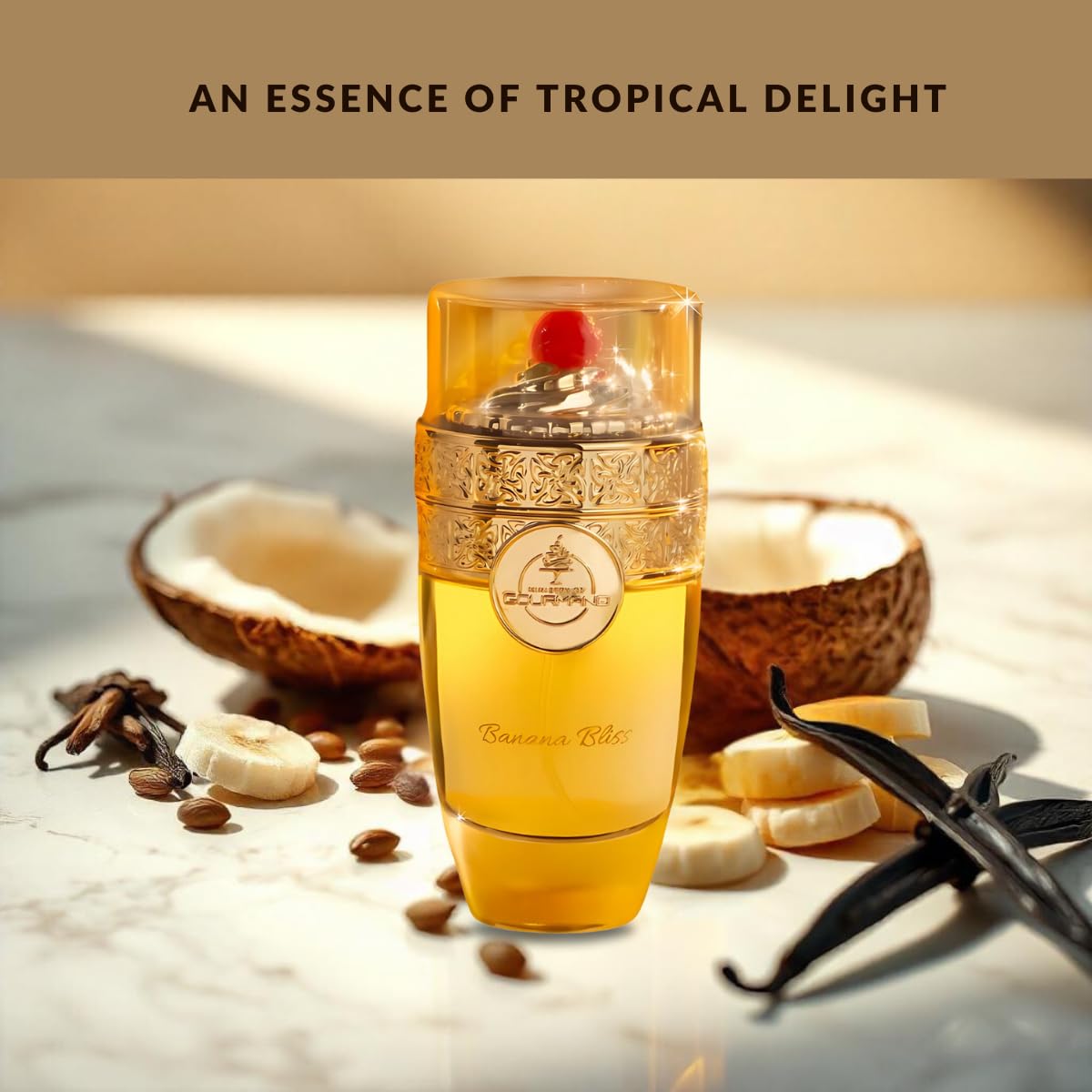 Paris Corner Banana Bliss, a delightful unisex Eau de Parfum that captures the essence of tropical bliss. This enchanting fragrance, presented in a generous 3.38 Fl Oz (100ml) bottle, is designed for both men and women who appreciate the playful yet sophisticated allure of gourmand scents.